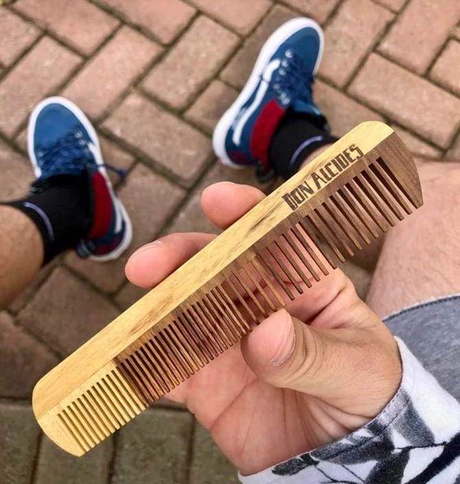 Como os fios da barba crespa são bem mais enrolados, utilizar o pente de madeira é uma boa ferramenta para te ajudar a desembolar a sua barba. Além de não quebrar os fios, ele auxilia na retirada da eletricidade estática, mantendo-os mais alinhados e bonitos.